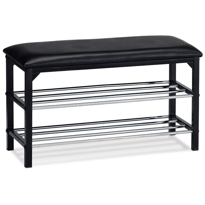 Botník s taburetom kombinuje praktické usporiadanie s pohodlným sedením. Čierny matný kovový rám je doplnený o dve chrómované police, ktoré poskytujú dostatok priestoru na uloženie obuvi. Sedák je potiahnutý čiernou ekokožou, ktorá sa ľahko udržiava a ponúka komfortné miesto na sedenie pri obúvaní. Kompaktné rozmery a minimalistický dizajn umožňujú jednoduché začlenenie do rôznych interiérov, najmä predsiení a vstupných hál.