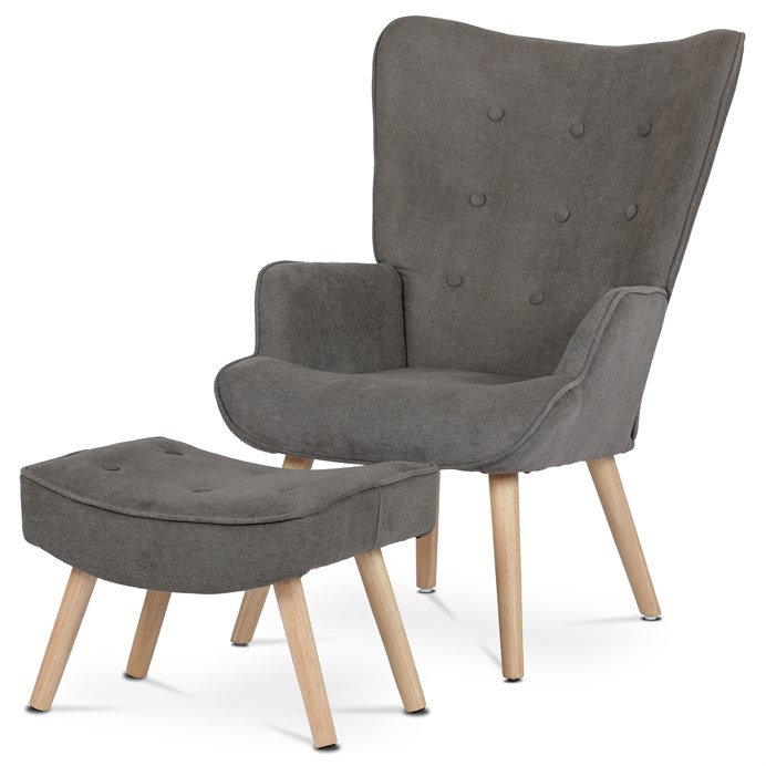 Kreslo ušiak s podnožkou ponúka komfortné sedenie vďaka širokému sedáku a vysokému operadlu s charakteristickými krídlami, ktoré poskytujú oporu hlave a ramenám. Poťah je z hnedej látky s jemnou štruktúrou, ktorá je príjemná na dotyk a ľahko sa udržiava. Masívne nohy z kaučukovníka zabezpečujú stabilitu a dlhú životnosť nábytku. Súčasťou je aj samostatný taburet s rovnakým poťahom a drevenými nohami, ktorý umožňuje pohodlné opretie nôh. Kreslo je vhodné na relaxáciu v obývačke alebo čitacom kútiku.