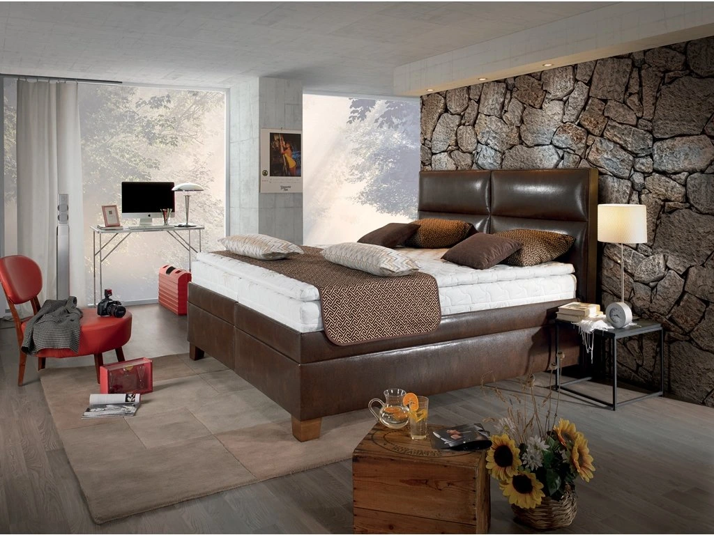 ZÁKLADNÝ BOXSPRING (bez vrchných matracov) – okraj postele prevyšuje základný Boxspring a zabraňuje takzvanému sklzu horného matraca. Duté vlákno a poťahová látka zmäkčuje rám postele. Vzdušné pružinové jadro, textil, pena a duté vlákno sú pevne pričalúnené k lamelovými masívnemu rámu. Masívny drevený polohovací rám (6 polôh) s lamelami umožňuje prístup od nôh k úložnému priestoru. Úložný priestor dostatočnej veľkosti s odvetrávaním zaisťuje prívod vzduchu k matracom.