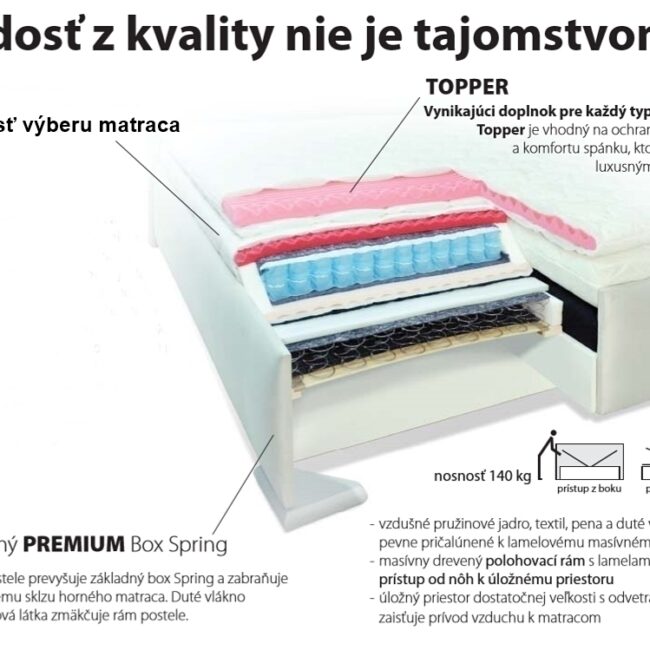 ZÁKLADNÝ BOXSPRING (bez vrchných matracov) – okraj postele prevyšuje základný Boxspring a zabraňuje takzvanému sklzu horného matraca. Duté vlákno a poťahová látka zmäkčuje rám postele. Vzdušné pružinové jadro, textil, pena a duté vlákno sú pevne pričalúnené k lamelovými masívnemu rámu. Masívny drevený polohovací rám (6 polôh) s lamelami umožňuje prístup od nôh k úložnému priestoru. Úložný priestor dostatočnej veľkosti s odvetrávaním zaisťuje prívod vzduchu k matracom.