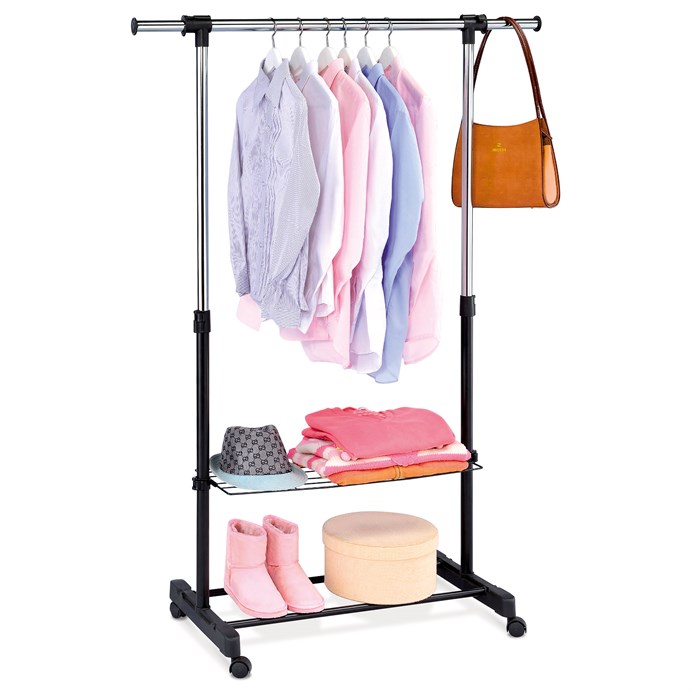 Stojan na šaty s odkladacím priestorom a poličkou v čiernom prevedení kombinuje pevný kovový rám s chrómovanými prvkami pre moderný vzhľad a dlhú životnosť. Výškovo nastaviteľná tyč umožňuje zavesenie oblečenia rôznych dĺžok, zatiaľ čo spodná drôtená polička ponúka priestor na uskladnenie topánok alebo ďalších doplnkov. Praktický odkladací priestor na boku je vhodný na zavesenie tašiek či šál. Stojan je vybavený štyrmi kolieskami pre jednoduchú manipuláciu a stabilnou základňou, ktorá zabezpečuje bezpečné postavenie aj pri plnom zaťažení. Vďaka kombinácii kovu a plastu je ľahko udržiavateľný a vhodný do domácností aj komerčných priestorov.