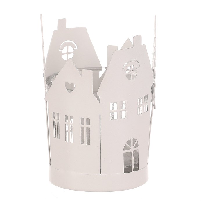 Svietnik kovový, tvar domčekov so stromčekmi – sklo vo vnútri, farba biela